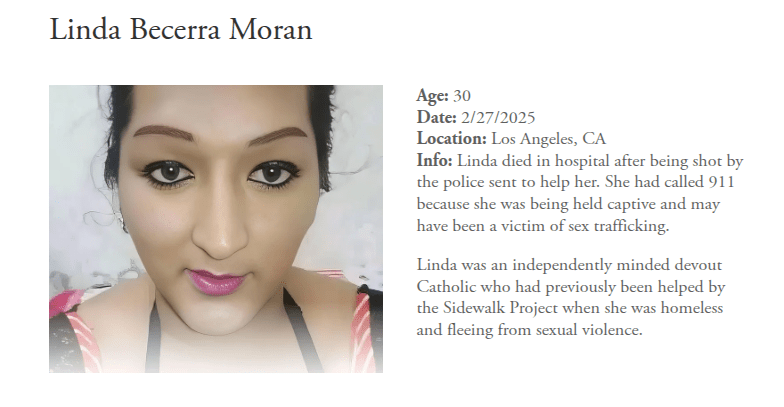 - LGBTQ+ community demanding justice after sex trafficking victim was shot by LAPD after calling for help – Full video recording of the vigil held to honor Linda on 3/14/25 by The Sidewalk Project, TransLatin@ Coalition, and CAST (Coalition to Abolish Slavery & Trafficking).
